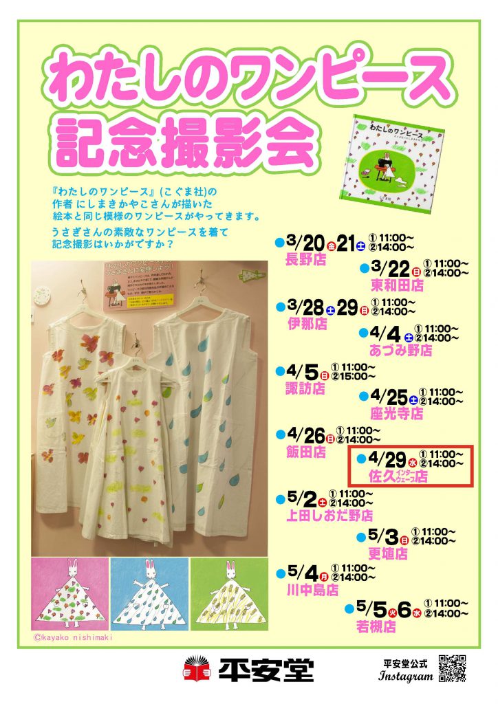 🌸わたしのワンピース(こぐま社)の作者 にしまきかやこさんが描いた絵本と同じ模様のワンピースがやってきます👗☔うさぎさんのステキなワンピースを着て記念写真をとりましょう🐰