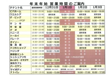 SALE & SHOP NEWSセール & ショップニュース 🎍年末年始営業時間のお知らせ🎍年末年始は各店ごと営業時間が異なります。 2025年の ご愛顧を感謝申し上げます🐍 2026年も 🐎宜しくお願いいたします🎍 ※年末年始は各店ごとに営業時間が異なりますのでご確認の上ご来店くださいませ。 年末年始営業時間のご案内 2025/12/30 管理事務所のニュース一覧>> 1